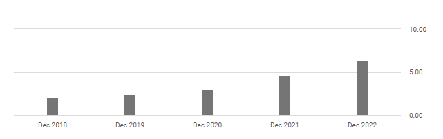 5년간 배당성장률은 27.86%로 배당성장주로서 매력적이다. 보통 배당증액이 시작되고 시간이 지날수록 배당성장률이 낮아지는 경향이 있는데, VRTS는 연간 배당성장률이 점점 높아지고 있다. 2023년 10월 배당이 얼마나 증가할지 기대된다.