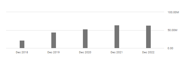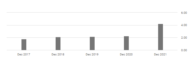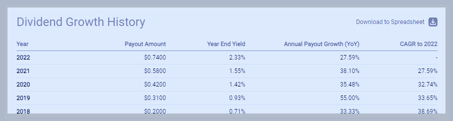 5년간 배당성장률은 38.69%로 배당성장주로써 아주 매력적입니다. 매년 30%대의 비슷한 비율로 배당금을 증액했습니다.