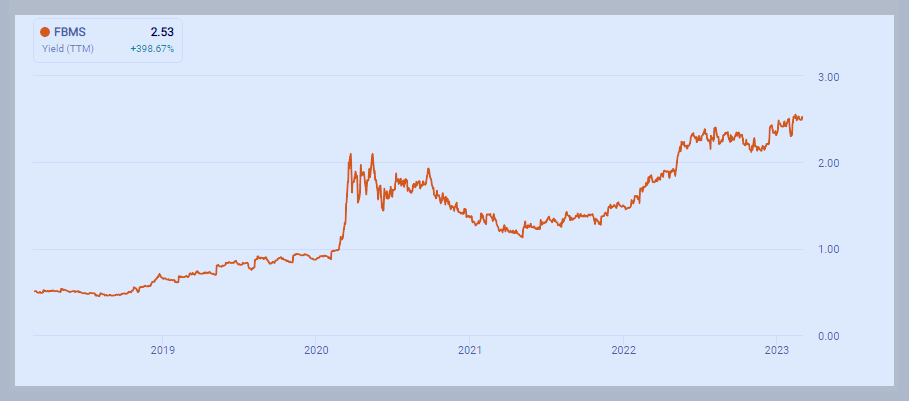 FBMS은 2015년부터 배당금을 증액했고, 최근 5년간 배당성장했습니다. 5년간 배당성장률은 36.85%입니다.